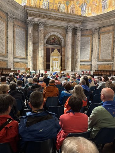 Nach so vielen Eindrücken, kommt die Mittagspause gerade recht, die, wir sind in Rom, wie soll es also anders sein, mit Pizza essen verbracht wurde. Im Anschluss geht es weiter, zur Basilika Santa Maria Maggiore. Bei der Ankunft wird klar, was zu dieser Wallfahrt auch gehört ist, das Anstehen und Abwarten. Doch das trübt die Stimmung in der Gruppe nicht. Beim Warten wird geplaudert und gebetet, sich ausgetauscht oder sinniert. In der Zwischenzeit gesellte sich auch Bischof Wiesemann zur Gruppe, der via Kopfhörer der Pilgergruppe beim Durchschreiten der Heiligen Pforte on Santa Maria Maggiore einige besinnliche Gedanken mitgab. Wer die Kirche erkunden wollte, konnte dies gemeinsam mit einer Touristenführerin machen. Und dann hieß es nochmal anstehen, um einen besonderen Moment vor dem Grab von Papst Franziskus zu erhaschen und für ihn zu beten.